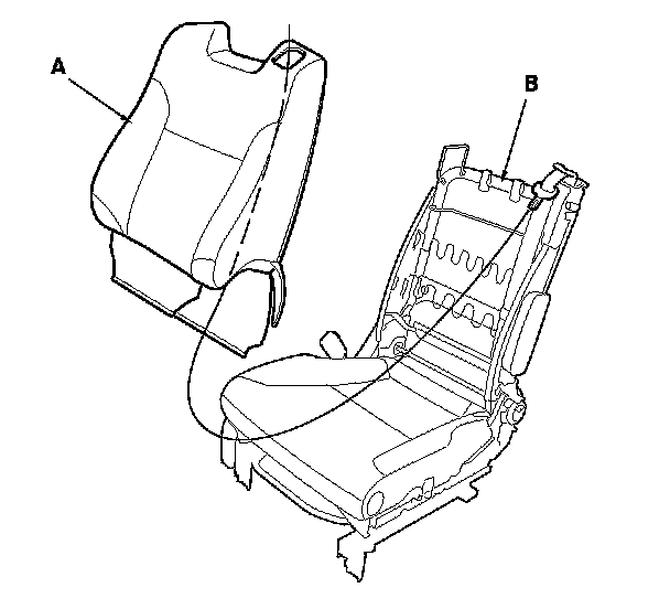 14. Remove the seat-back cover/pad (A) from the seat-back frame (B).