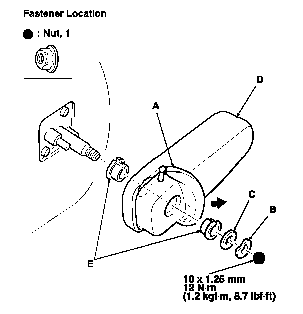 2. Remove the nut, the wave washer (B) and the washer (C), then remove the armrest (D). If necessary, remove the bushings (E) from the armrest.