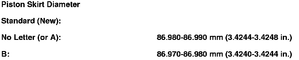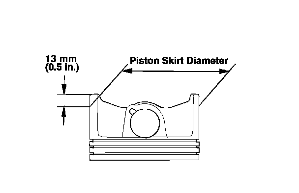 3. Measure the piston diameter at a point 13 mm (0.5 in.) from the bottom of the skirt. There are two standard-size pistons (No Letter or A, and B). The letter is stamped on the top of the piston. Letters are also stamped on the engine block as the cylinder bore sizes.