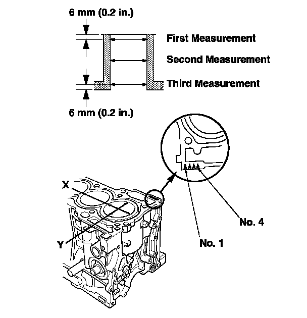 4. Measure the wear and taper in direction X and Y at three levels in each cylinder as shown. If the measurements in any cylinder are beyond the Oversize Bore Service Limit, replace the engine block. If the engine block is being rebored, refer to step 7 after reboring.