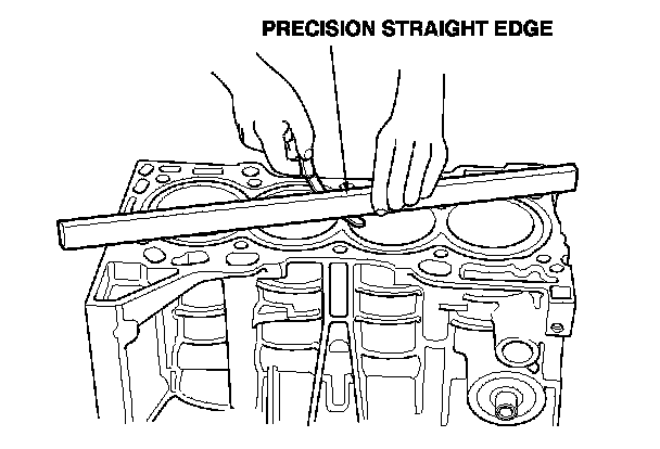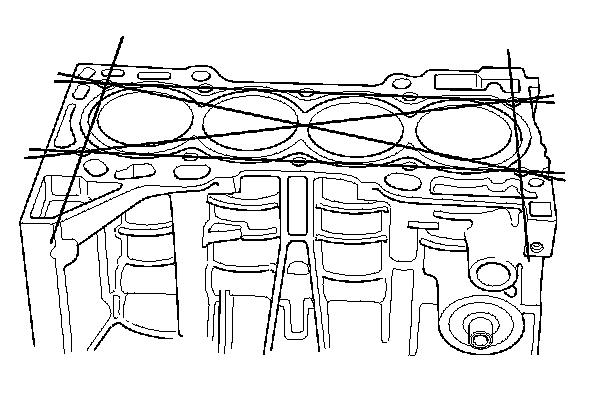 6. Check the top of the engine block for warpage. Measure along the edges, and across the center as shown.