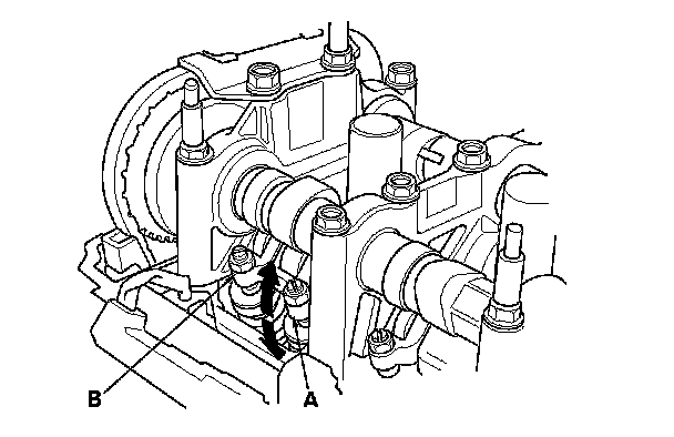 4. Verify that the intake primary rocker arm (A) moves independently of the intake secondary rocker arm (B).
