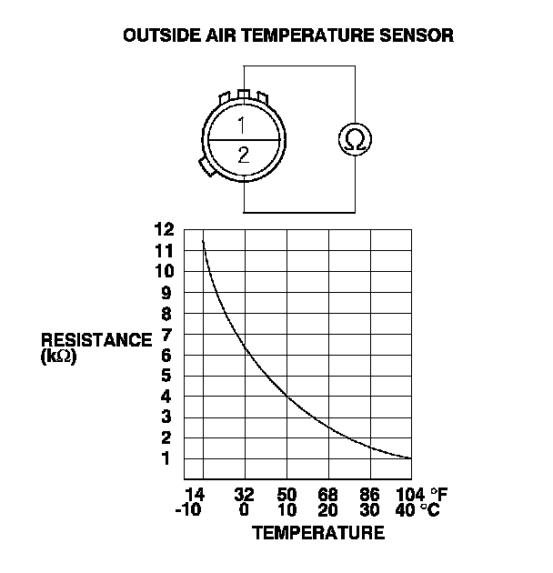 3. Compare the resistance reading between terminals No. 1 and No. 2 of the outside air temperature sensor with the specifications shown in the graph; the resistance should be within the specifications.