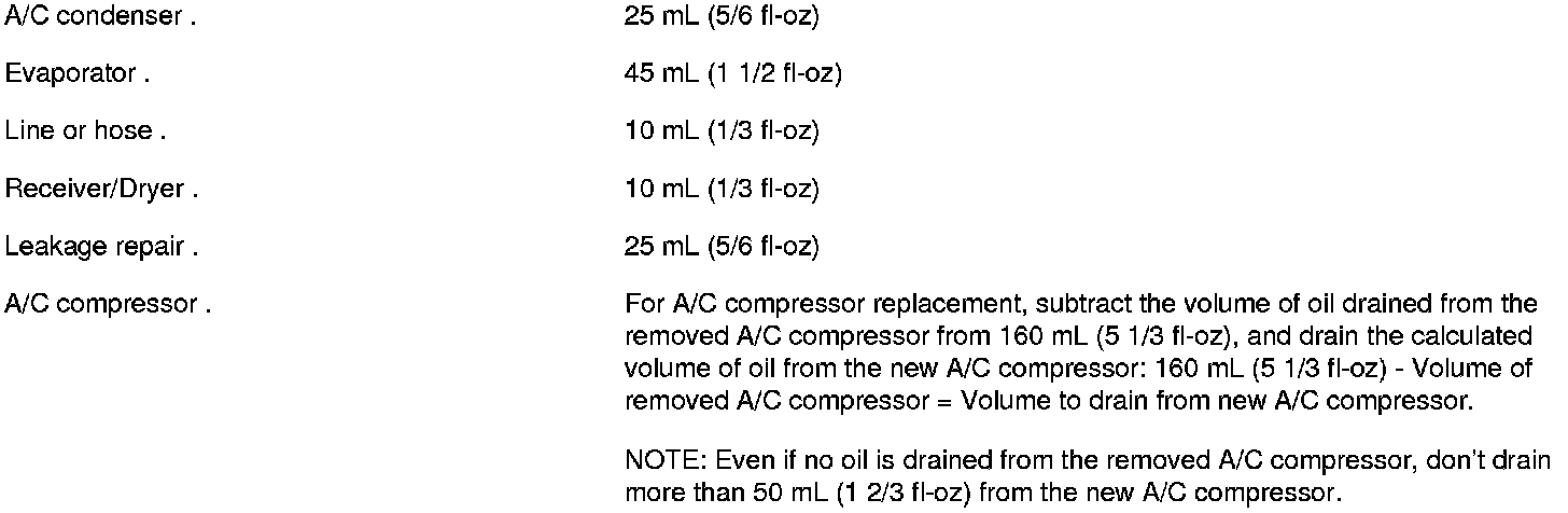 It is important to have the correct amount of refrigerant oil in the A/C system to ensure proper lubrication of the A/C compressor. Too little oil damages the A/C compressor; too much oil reduces the cooling capacity of the system, and can produce high vent temperatures.