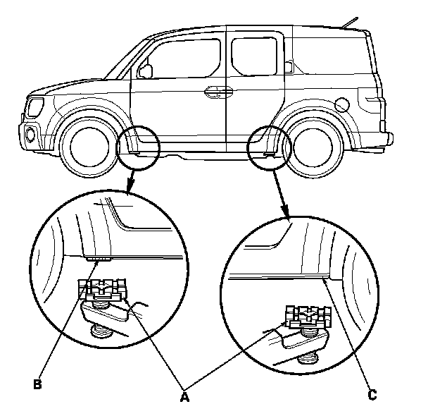 1. Position the lift blocks (A) under the vehicle's front support points (B) and rear support points (C).