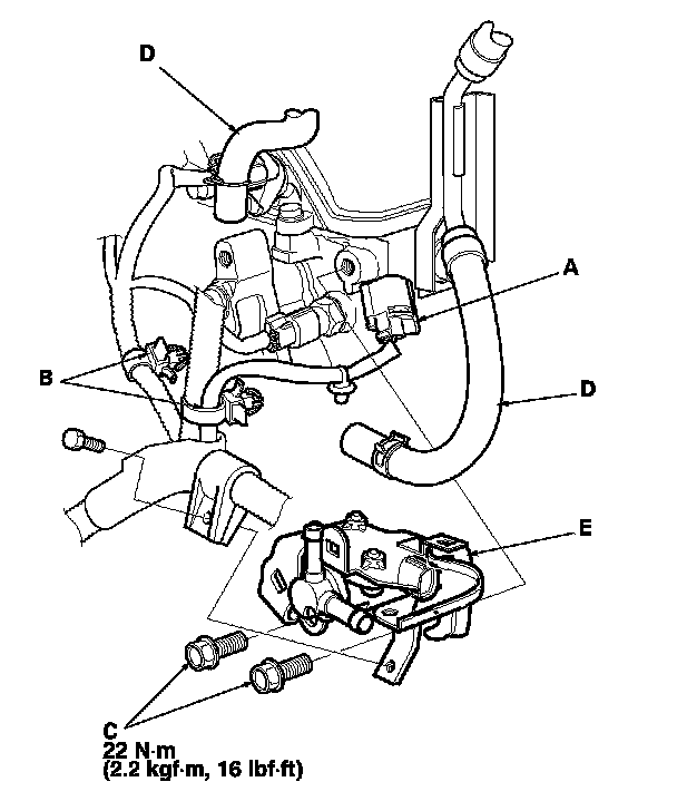2. Remove the harness clips (B), the bolts (C), and the hoses (D), then remove the EVAP canister purge valve assembly (E).