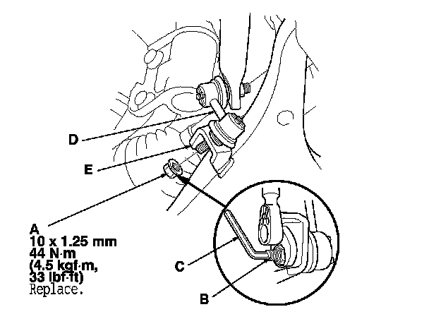 3. Remove the flange nut (A) while holding the joint pin (B) with a hex wrench (C), and disconnect the stabilizer link (D) from the lower arm (E).