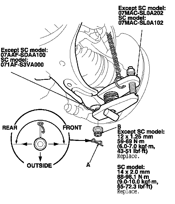 4. Remove the lock pin (A) from the knuckle ball joint, then remove the castle nut (B).