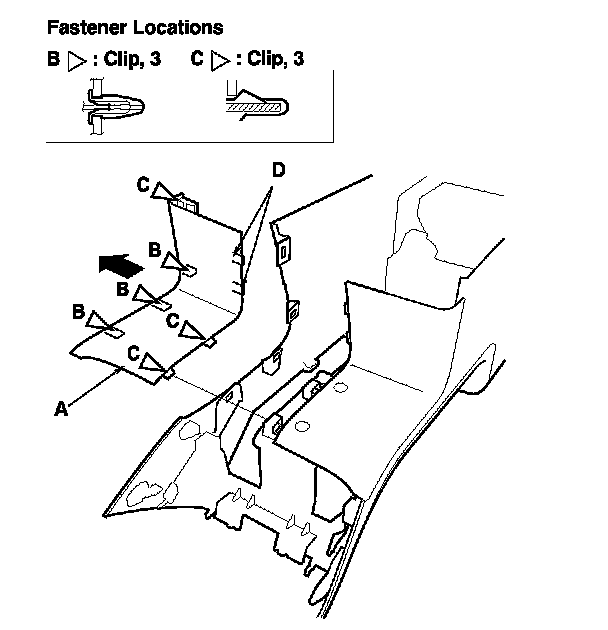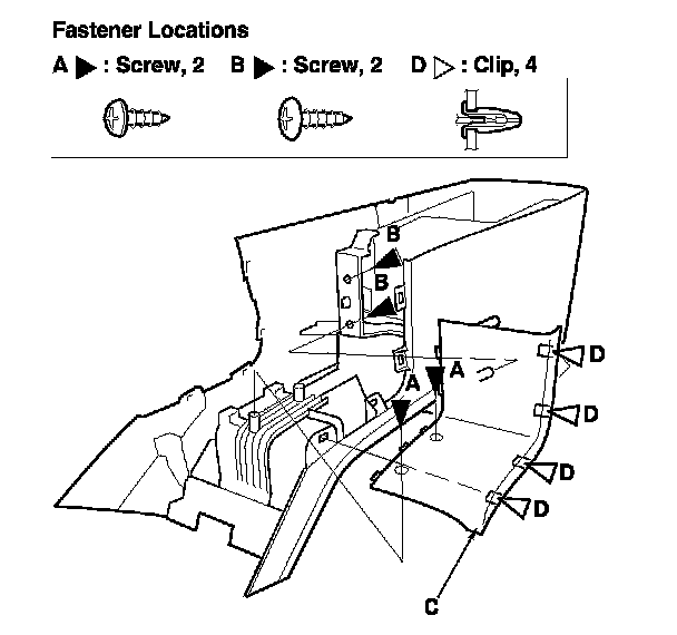 4. Remove the screws (A, B), and pull out the passenger's console trim (C) to detach the clips (D), then remove it.