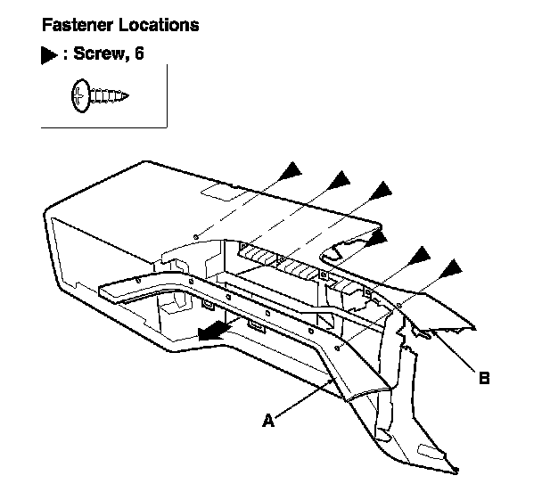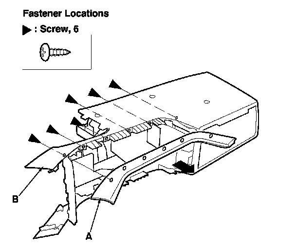 5. Remove the screws, then remove the center passenger's console side trim (A) from the center console (B).