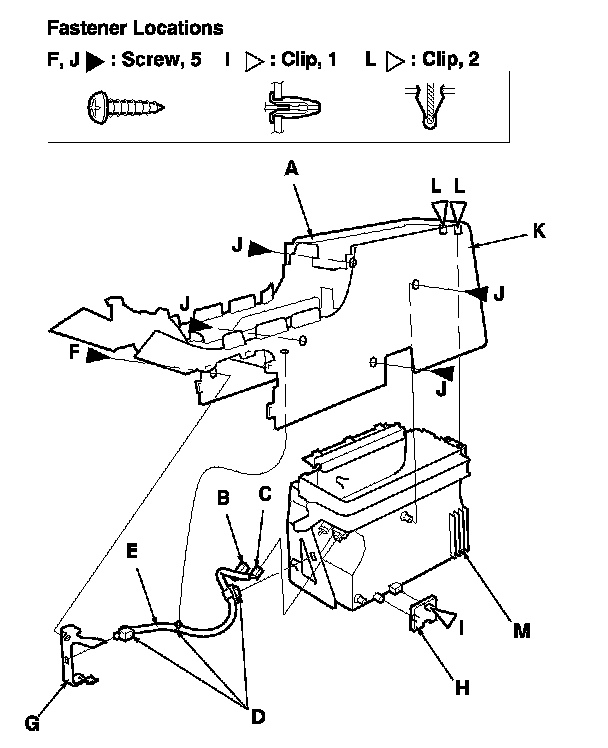 -4 Remove the screws (J), then pull out the center console (K) to detach the clips (L). Remove the center console from the console box (M).
