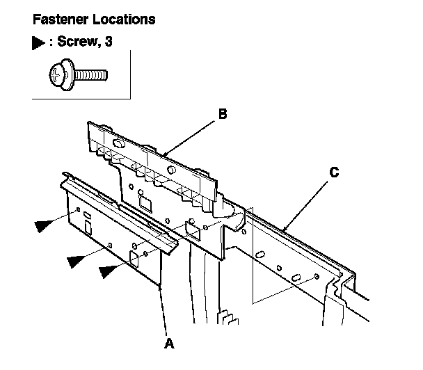 7. Remove the screws, and remove the lower hinge bracket (A) and the lower hinge (B) from the console box (C).