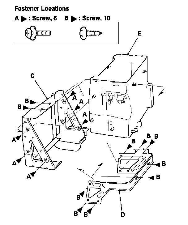 8. Remove the screws (A, B), and separate the frame brackets (C, D), then remove the center console box (E).