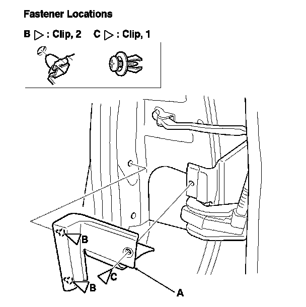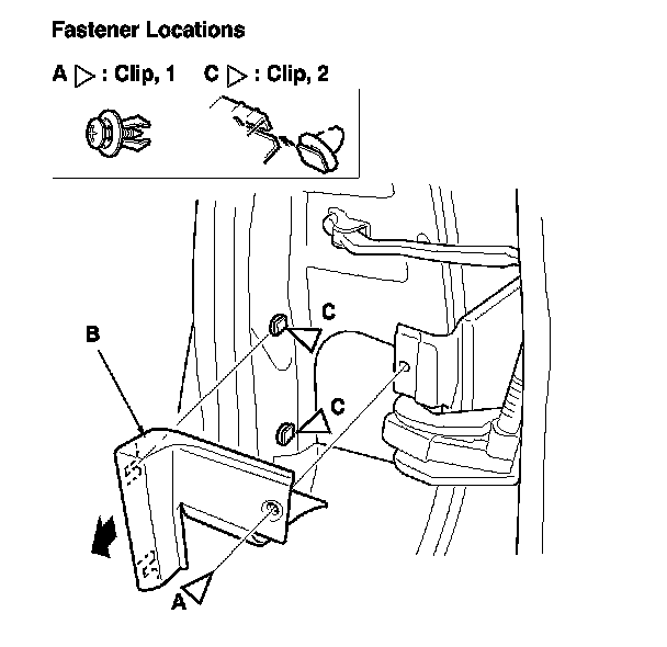 5. Open the rear door. Remove the clip (A), and pull out on the rear door hinge lower cover (B) to release it from the clips (C). Remove the clips from the body with a clip remover.