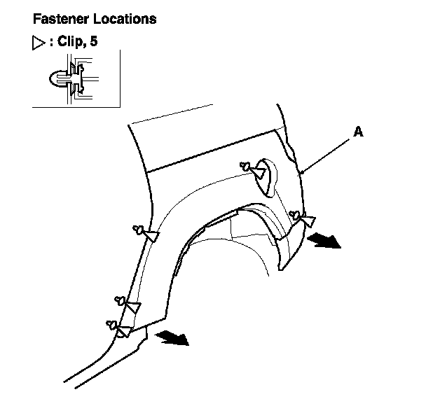 7. Close the rear door half-way. Pull out the rear bumper, the fuel fill door, and rear wheel arch portions of the rear quarter panel cladding (A) to detach the clips.