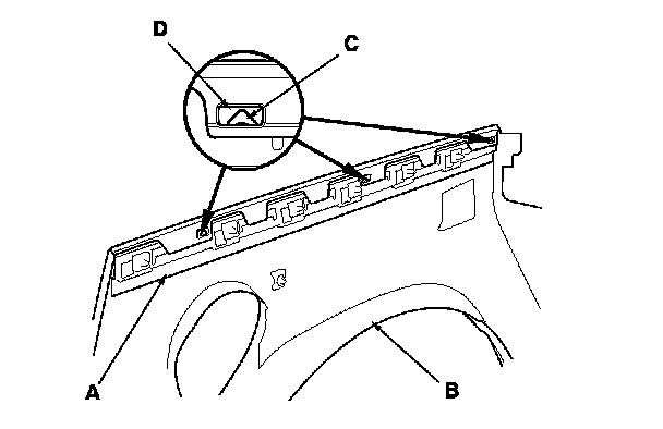 12. Attach the plate (A) to the rear quarter panel cladding (B) by aligning the hooks (C) with the holes (D) on the cladding, then slide the plate until the hooks engage securely.