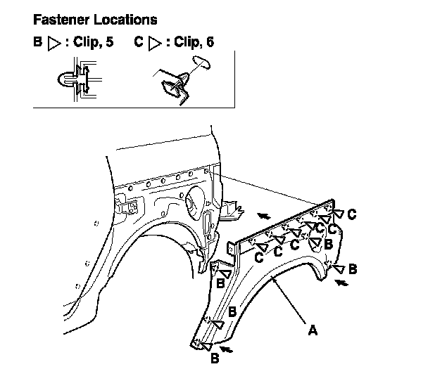 13. Open the rear door half-way, and install the front of the rear quarter panel cladding (A). Fit all the clips (B, C) into the holes in the body, then push on the cladding until the clips into plate.