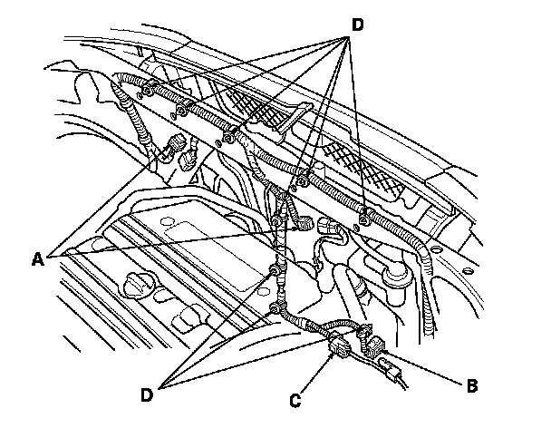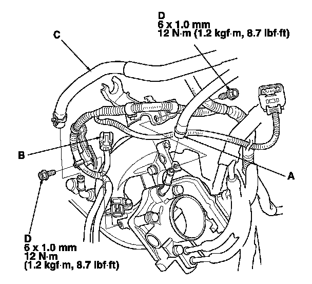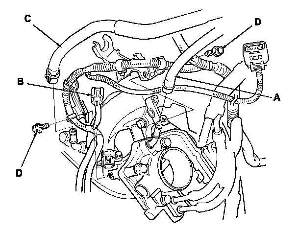 6. Remove the harness bracket mounting bolts (D).