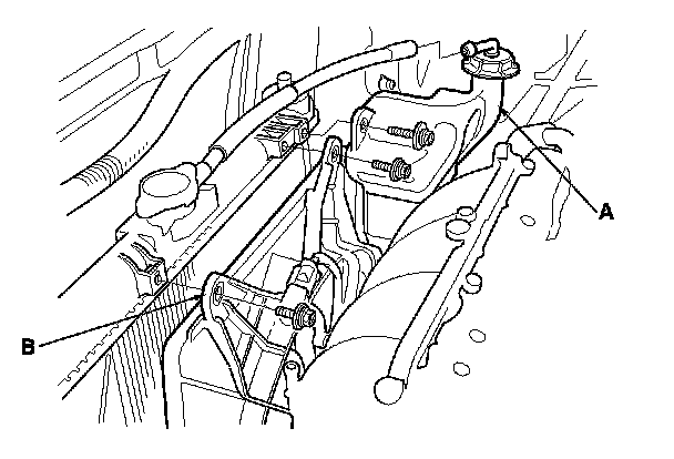 12. Remove the coolant reservoir (A), then remove the A/C condenser fan shroud (B).