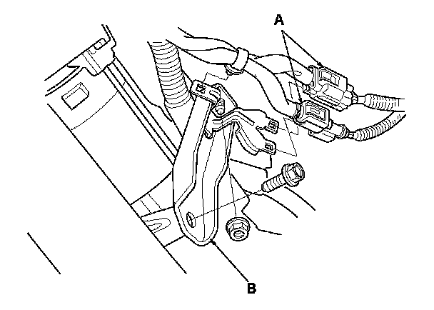 14. Disconnect the connectors (A), then remove the intake manifold bracket (B).