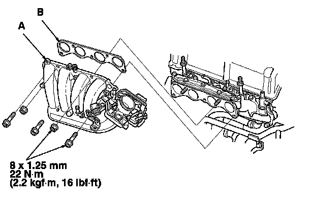 1. Install the intake manifold (A) with a new gasket (B), and tighten the bolts/nuts in a crisscross pattern in three steps, beginning with the inner bolt.