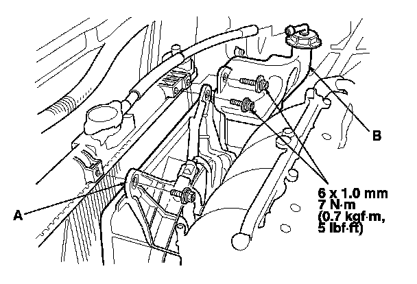 5. Install the A/C condenser fan shroud (A), then install the coolant reservoir (B).