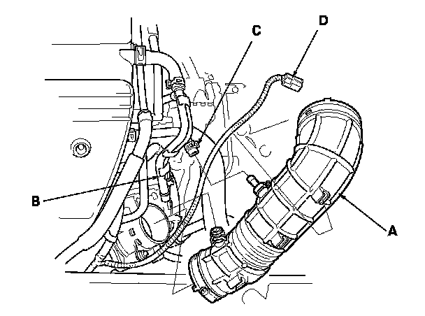 3. Disconnect the vacuum hose (B) and breather pipe (C), then remove the intake air duct (D).