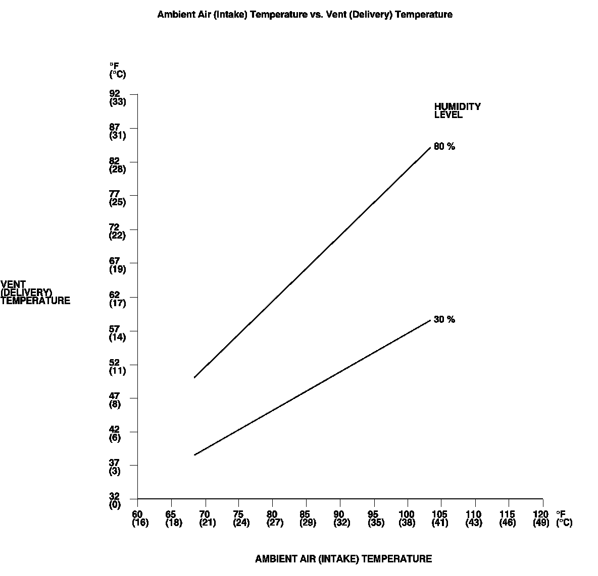 NOTE: The vent (delivery) and intake temperatures should intersect in the shaded area. Any measurements outside the line may indicate the need for further inspection.