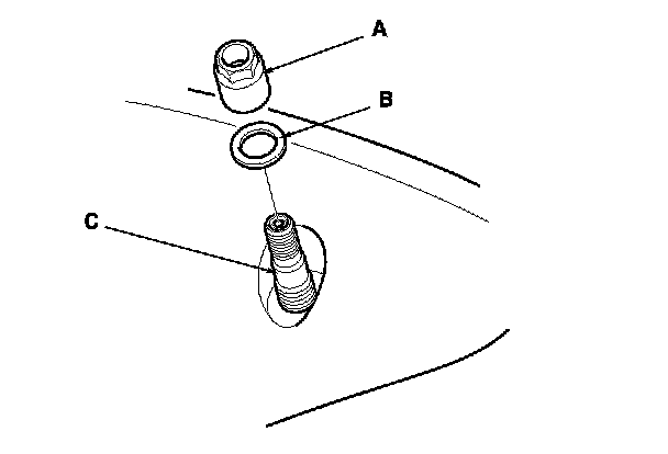 6. Remove the valve stem nut (A) and the washer (B), then remove the tire pressure sensor with the valve stem (C) from the wheel.