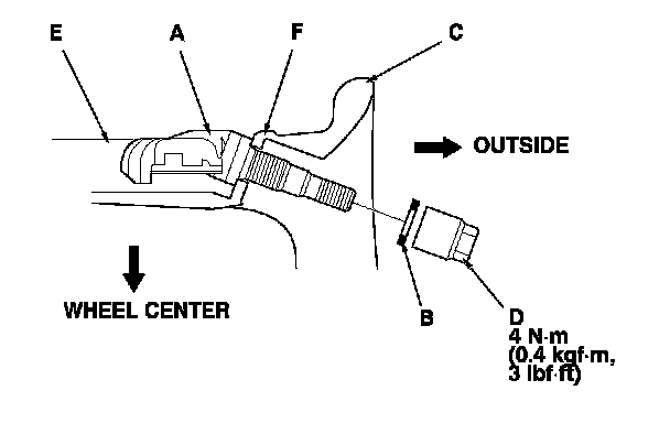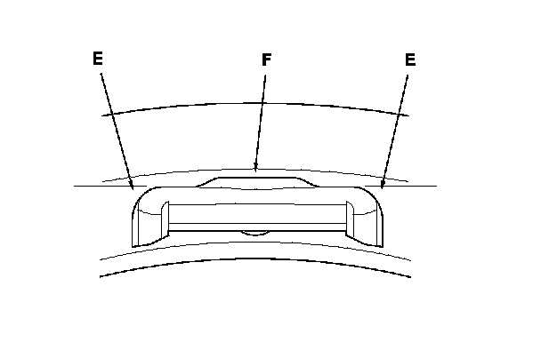 NOTE: Install the tire pressure sensor so that the sensor housing surface (E) does not extend beyond the protrusion (F) on the wheel to prevent the sensor housing from being caught on the bead of the tire when assembling the tire.