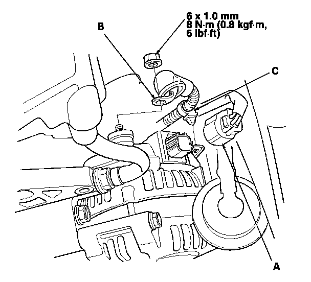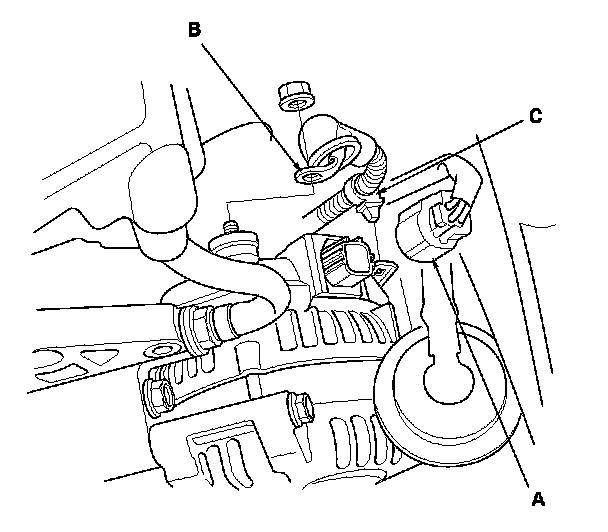 4. Disconnect the alternator connector (A) and the positive alternator cable (B), and remove the harness clamp (C) from the alternator.