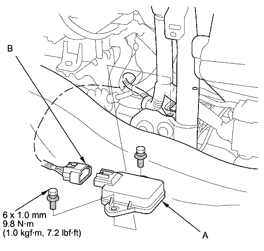4. Disconnect the yaw rate-lateral/longitudinal acceleration sensor 5P connector (B).