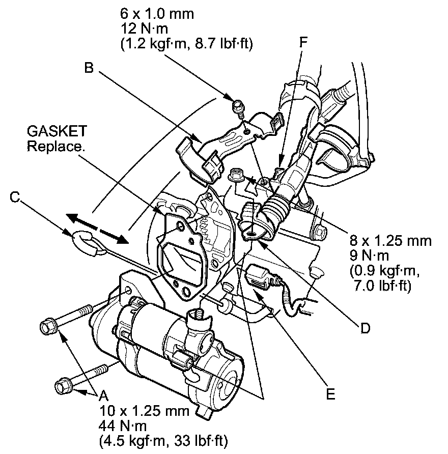 3. Connect the positive starter cable (D) and the S terminal connector (E) to the starter, then install the harness clamp (F). Make sure the crimped side of the ring terminal faces away from the starter when you connect it.