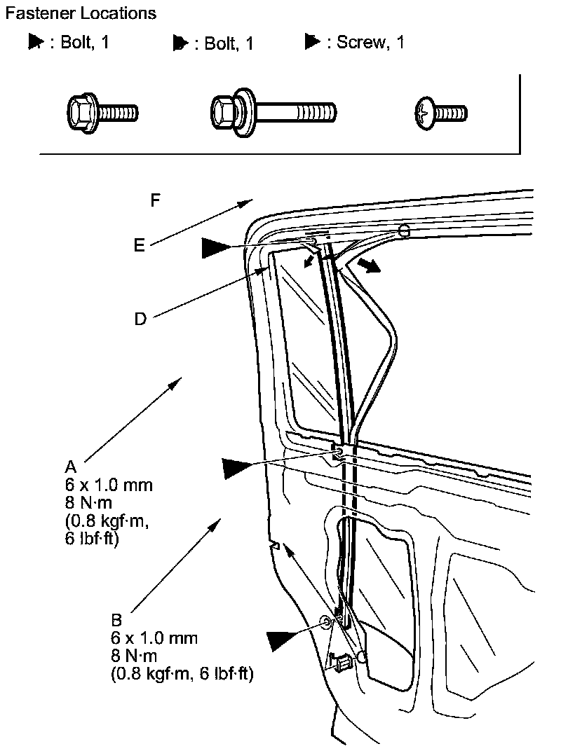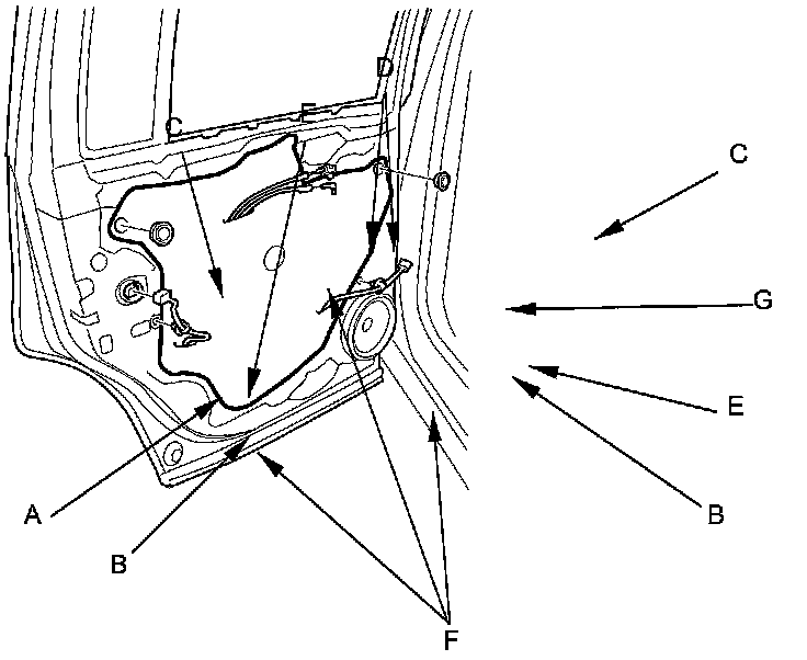5. Remove the bolts (A, B) and collar (C) from the center lower channel (D). Pull the door quarter glass seal (E) away as needed, and remove the screw (F). Pull the glass run channel (G) away as needed from the center lower channel.