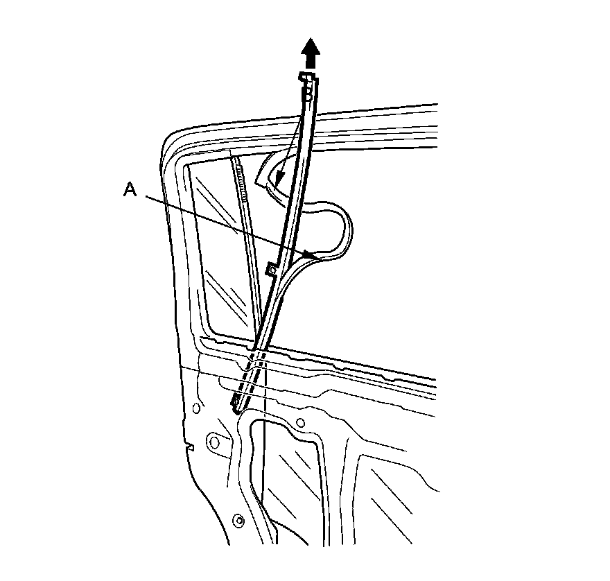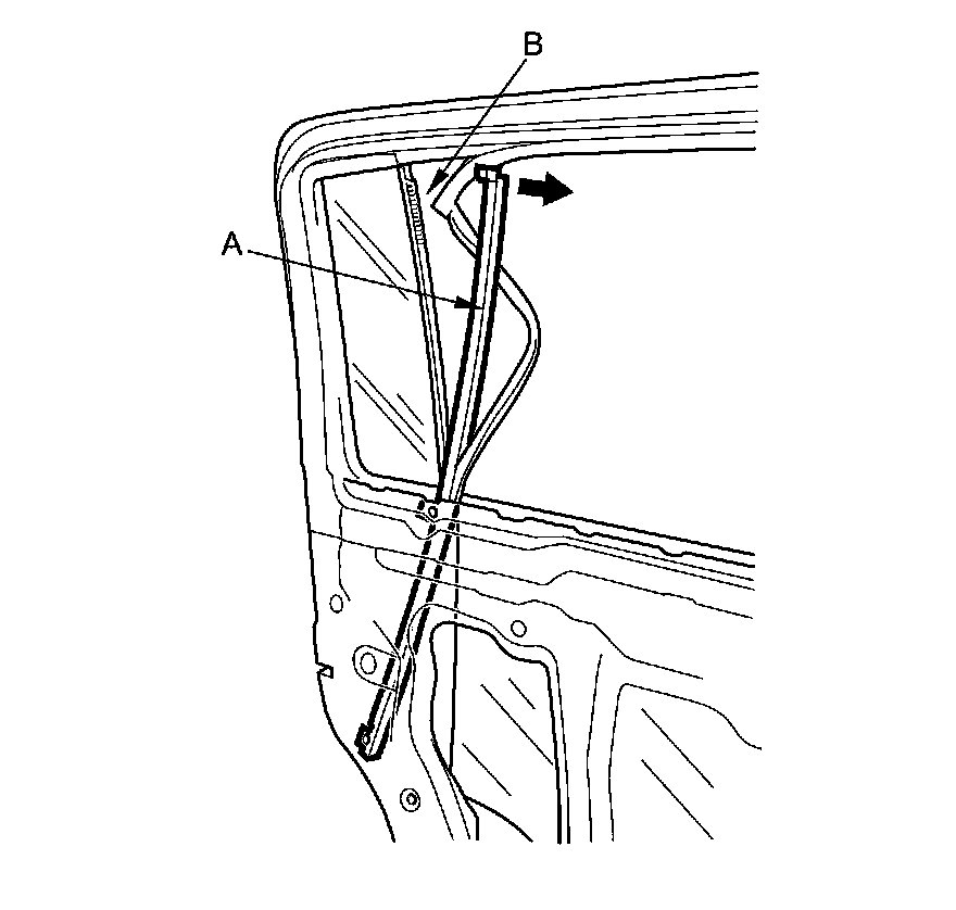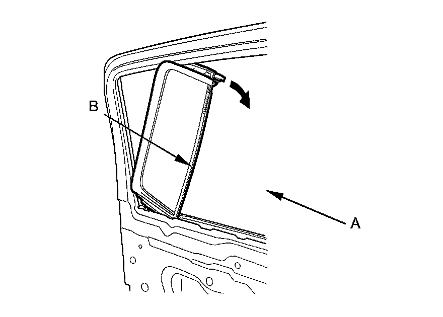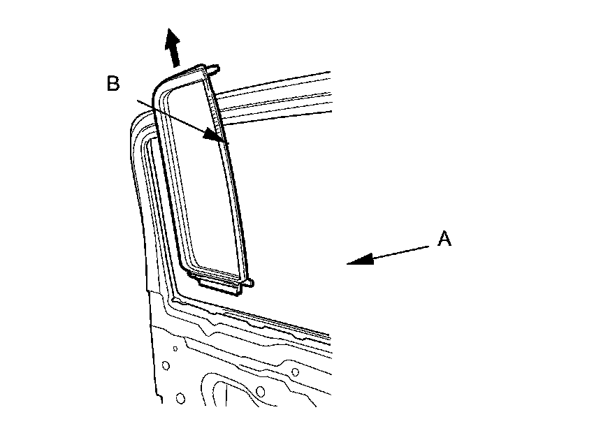 7. Remove the door quarter glass (A) and the seal (B) as an assembly from the door.