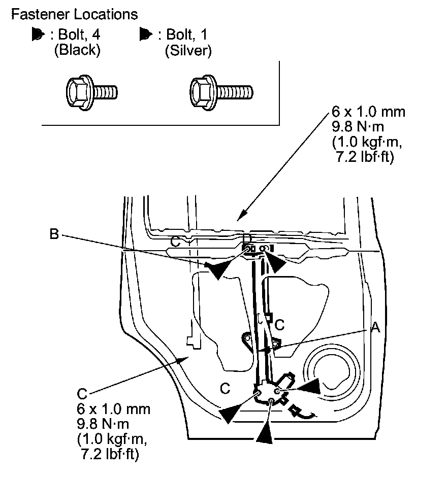 10. Remove the bolts (C), and loosen the bolt (D), then remove the regulator through the hole in the door.