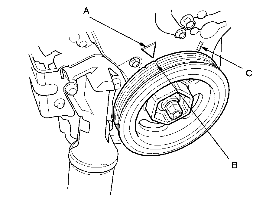 9. Aim the light toward the pointer (A) on the timing belt lower cover. Check the ignition timing under a no load condition (headlights, blower fan, rear window defogger, and air conditioner are turned off).