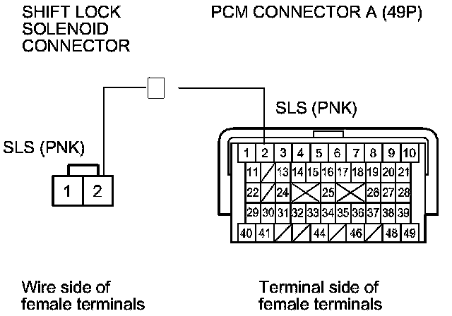 NOTE: Do not connect the positive battery terminal to the connector terminal No. 2 or you will damage the diode inside the shift lock solenoid.