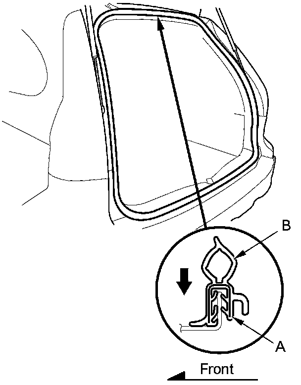 2. Locate the painted alignment mark (A) on the tailgate weatherstrip (B). Align the painted mark with the alignment tab in the center of the tailgate opening, and install the weatherstrip. Make sure it's seated completely and facing in the direction shown.