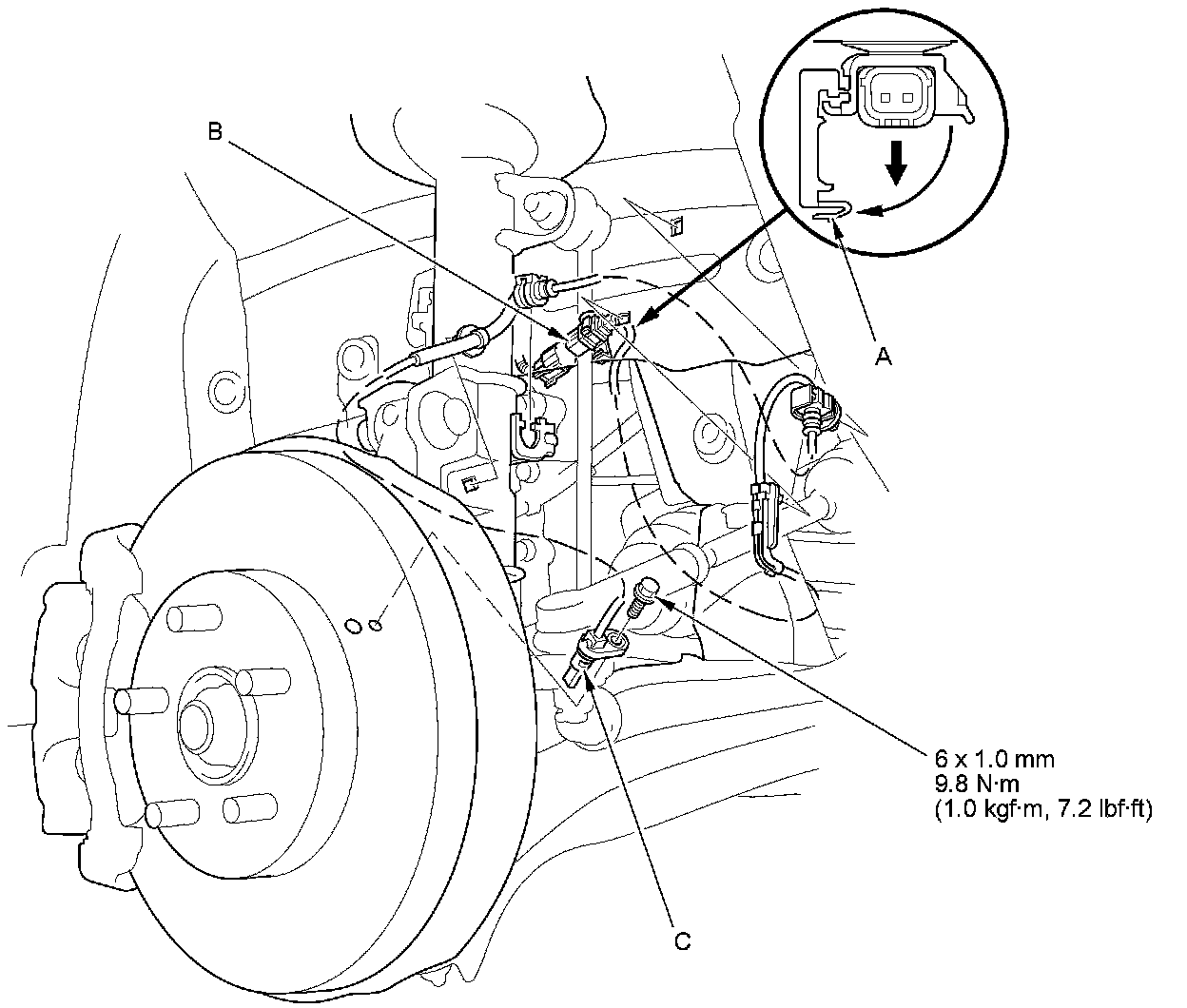 4. Remove the clips, the bolt, and the wheel speed sensor (C).