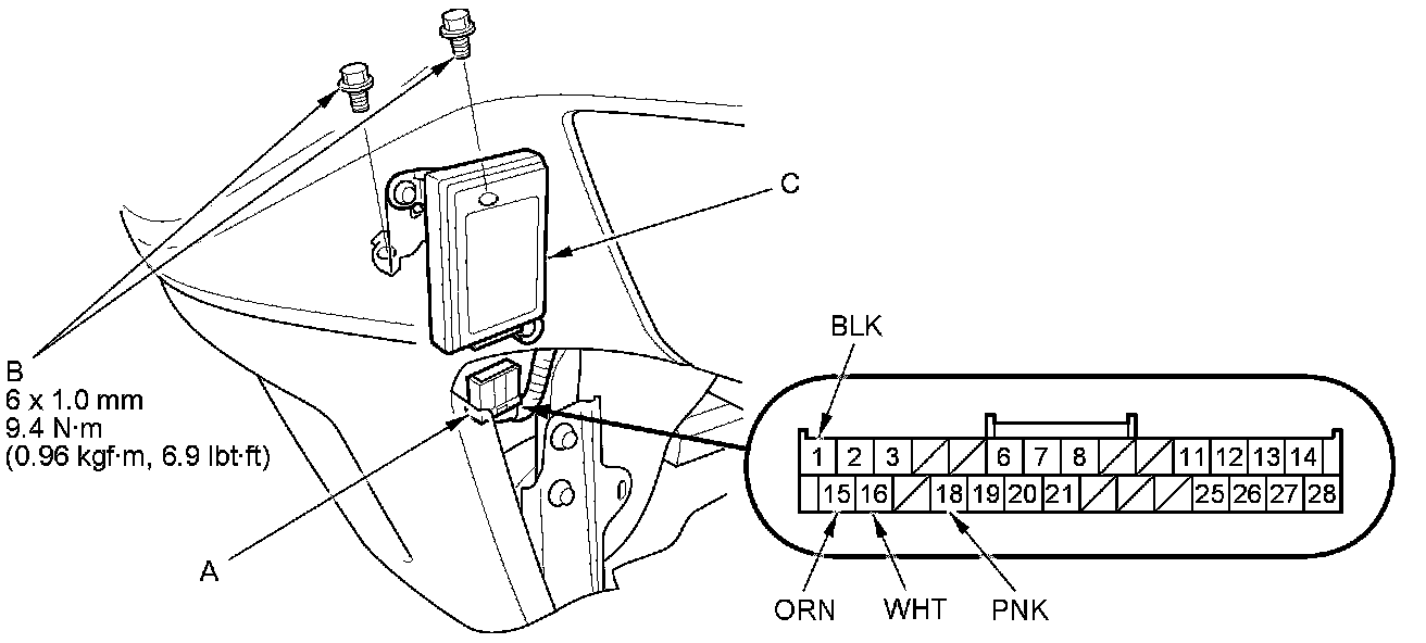 2. Disconnect the 28P connector (A) then remove the bolts (B) from the HandsFreeLink control unit (C).