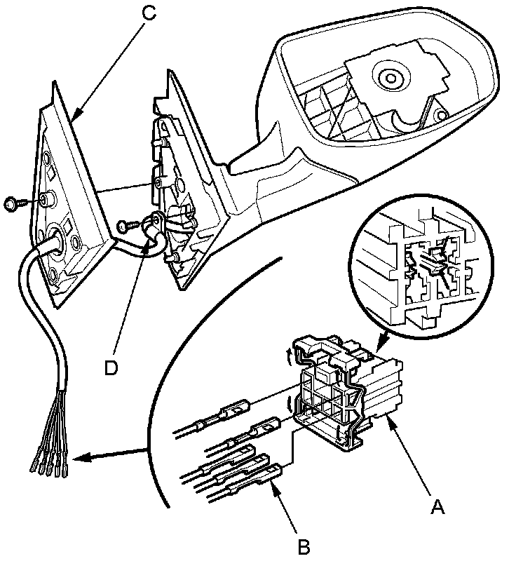 4. Disassemble the power mirror 6P connector, and remove all terminals (B) from the connector.