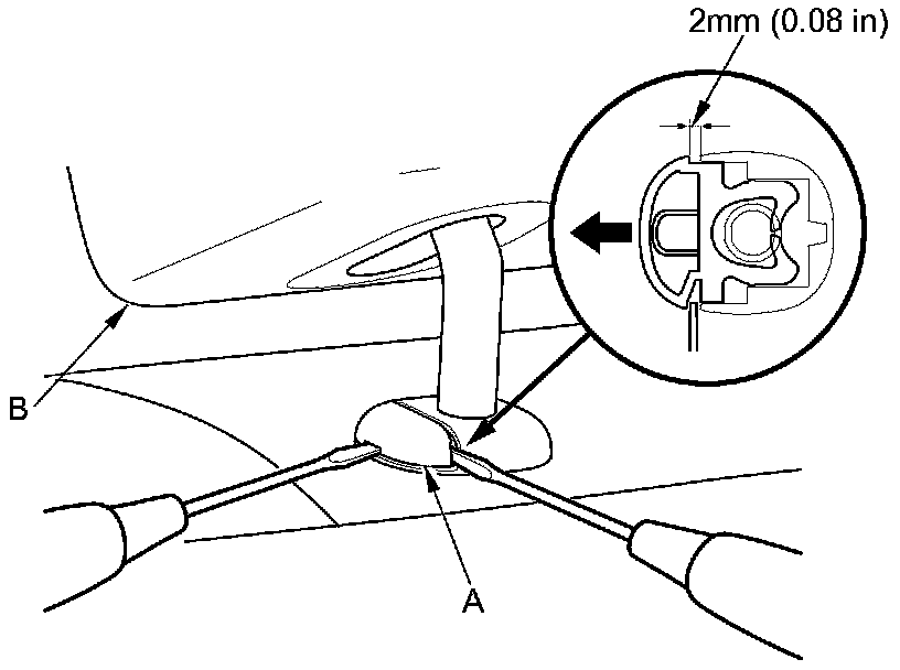 2. Insert a 5mm (0.20 in) thickness flat-tip screwdriver in one side of the notches on both sides of the knob (A), then the knob is moved out about 2mm (0.08 in).
