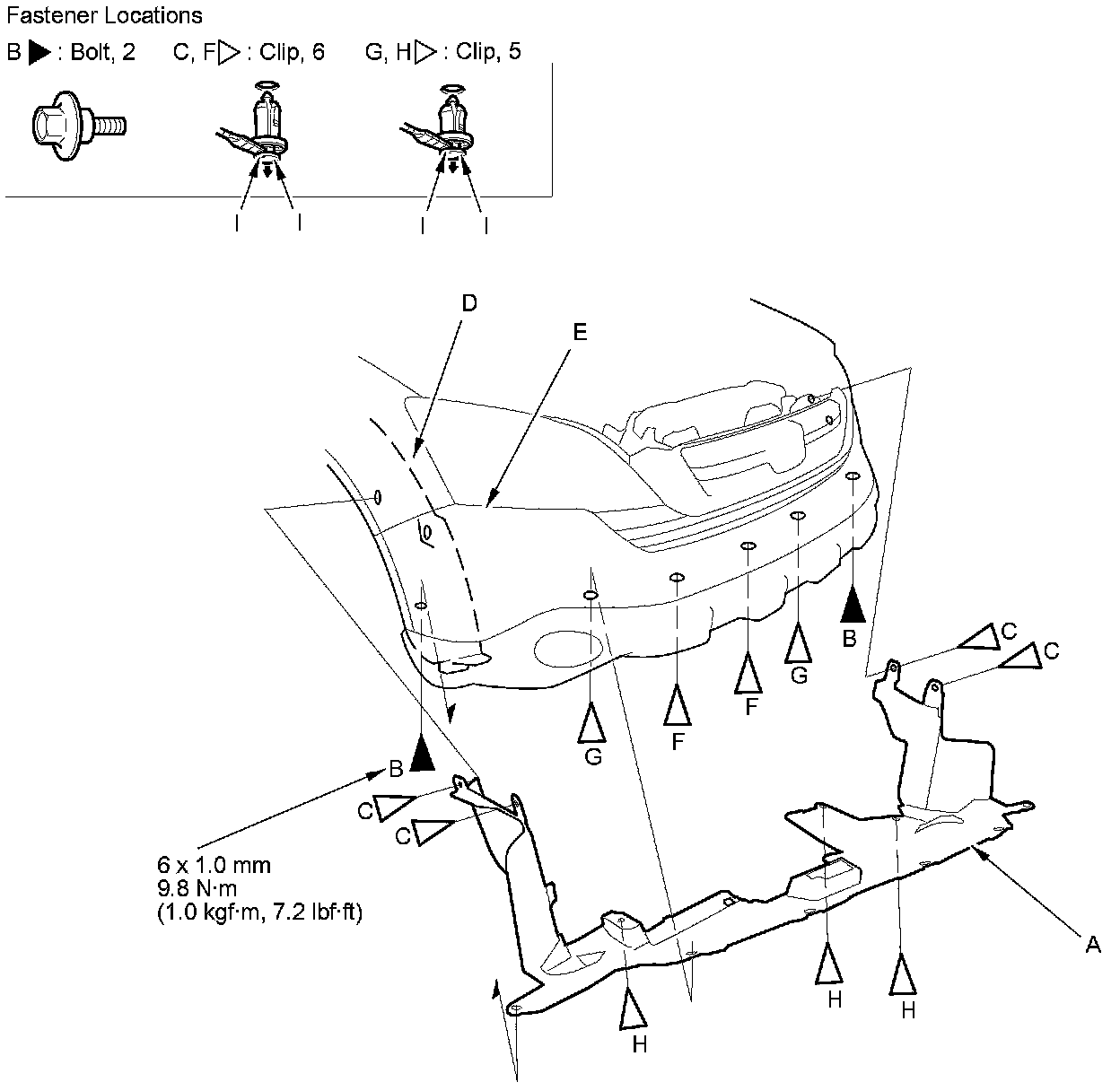 1. Remove the bolts (B), then remove the clips (C) that secure the front inner fender (D) and the front splash shield to the body.
