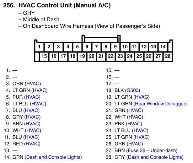 View 256 - HVAC Control Unit Connector View (Manual A/C)