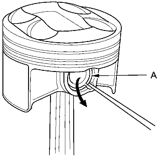 3. Remove the snap rings (A) from both sides of each piston. Start at the cutout in the piston pin bore. Remove the snap rings carefully so they do not go flying or get lost. Wear eye protection.