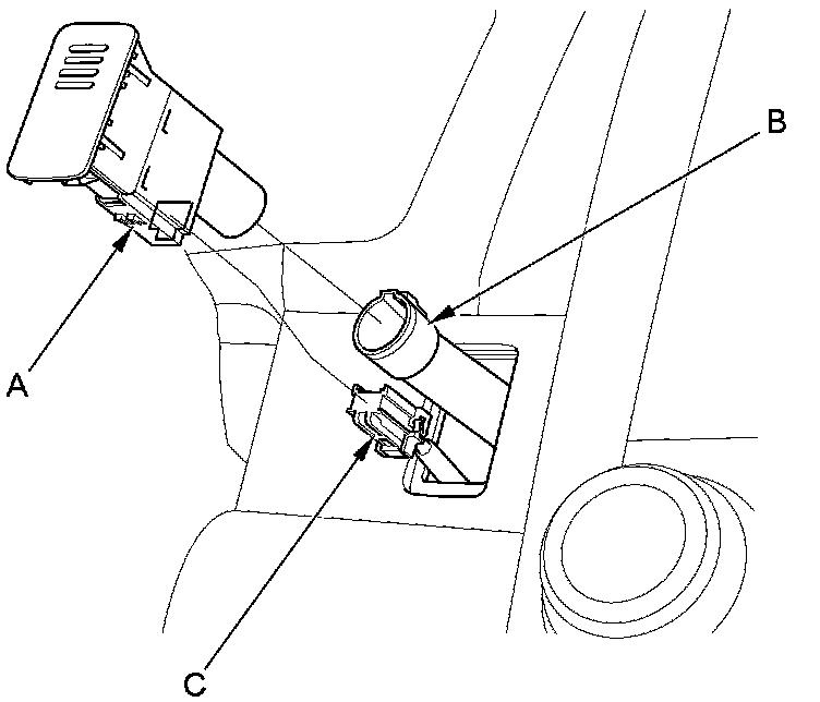 1. Push out the in-car temperature sensor (A) from behind the dashboard. Remove the air hose (B) from the in-car temperature sensor, then disconnect the 2P connector (C).