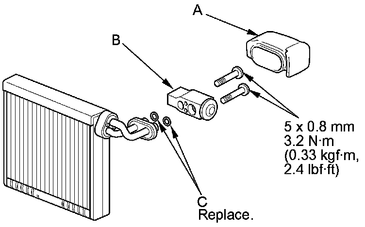 2. Remove the expansion valve cover (A), the bolts, the expansion valve (B), and the O-rings (C) without bending lines.