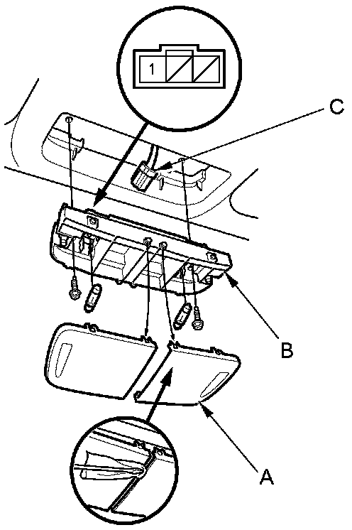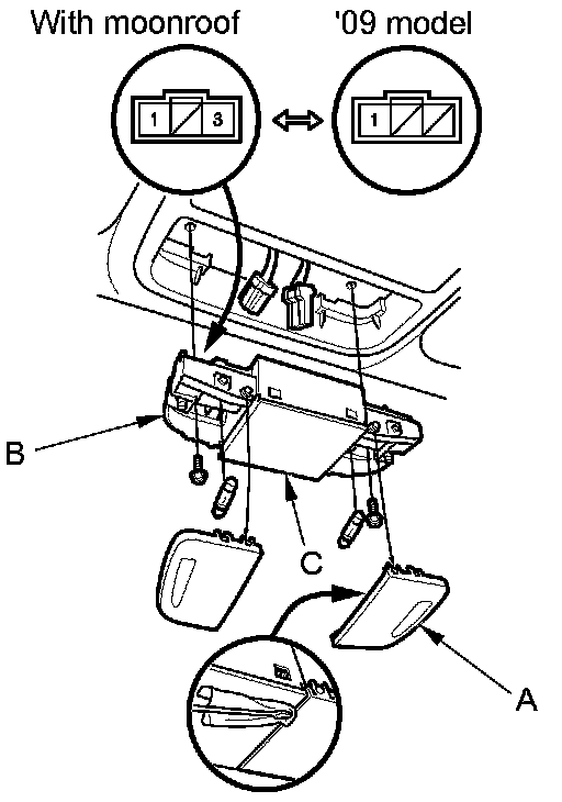 3. Remove the screws, then remove the map lights (B) and moonroof switch or navigation microphone (C).