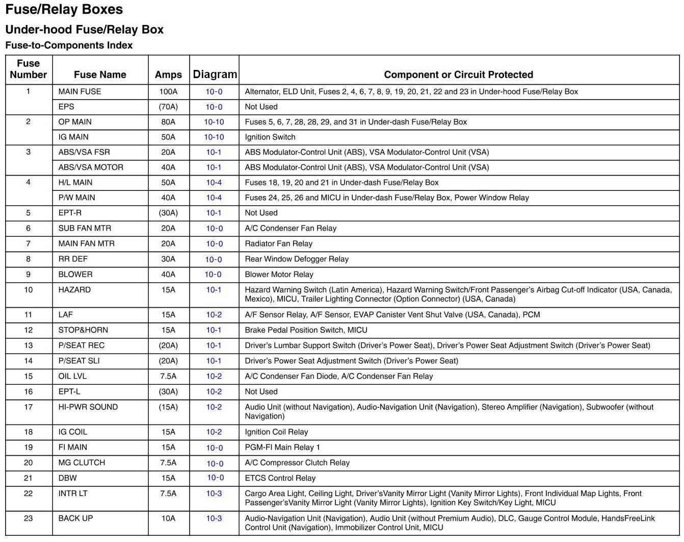 Under-Hood Fuse/Relay Box - Fuse-to-Components Index